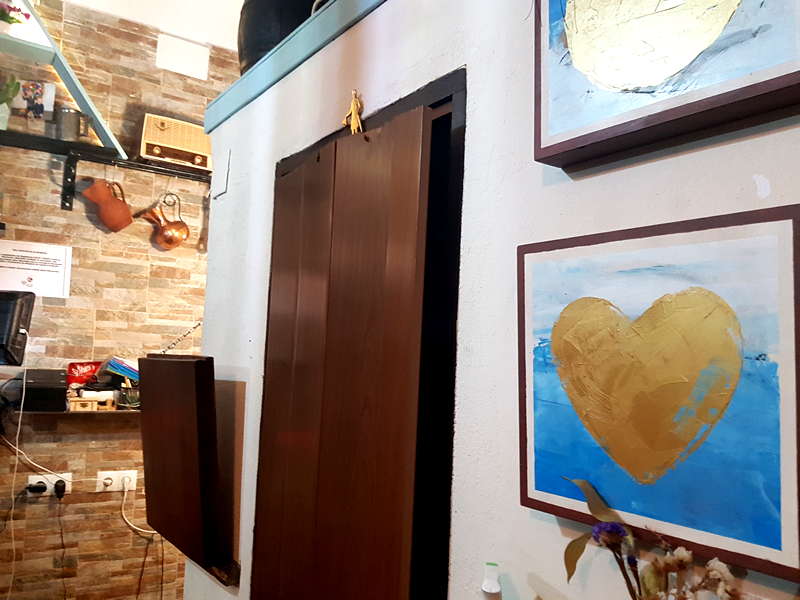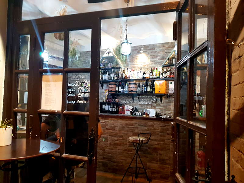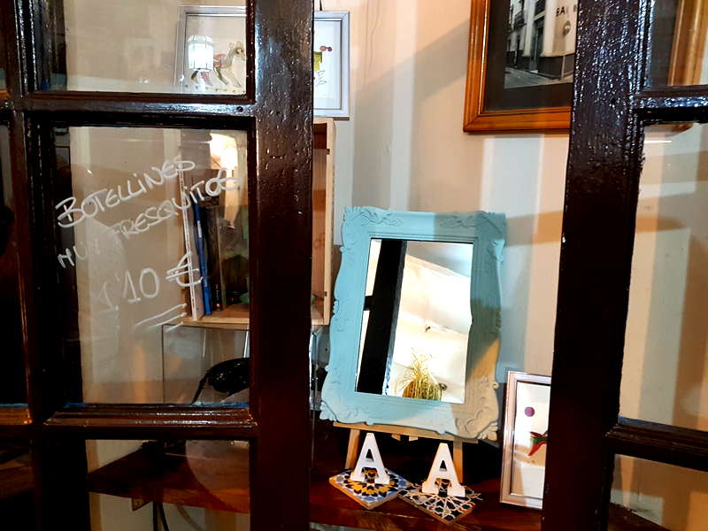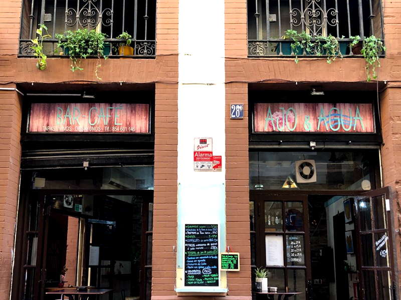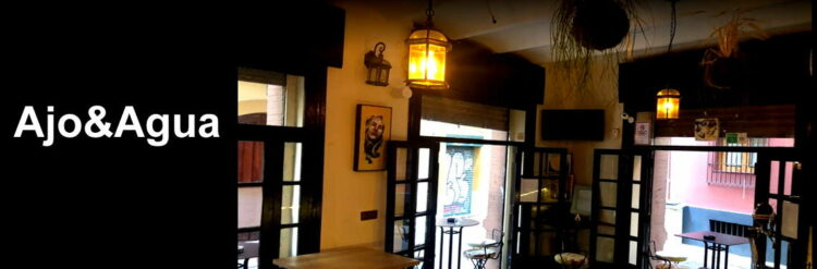 Ajo&Agua Bar-Café ocupa una esquina de la calle Boteros con Cabeza del Rey Don Pedro y cuenta con tres entradas de puertas abatibles de carpintería antigua acristalada que le dan amplitud al espacio. Al frente, una pequeña barra de madera atestada de productos, siguiendo la tradición de las antiguas abacerías. El local cuenta con murales de pizarra que anuncian el tapeo con tizas de colores, además de elementos decorativos de otras épocas, como una rueda de molino o una pequeña televisión antigua. Del techo cuelgan unas originales plantas que hacen juego con el estampado de los taburetes. Sus paredes están decoradas con coloristas cuadros de la artista Alexandra del Bene. Como falta espacio dentro, lo habitual es que los grupos de clientes se agrupen en taburetes y mesas altas en las entradas del establecimiento. Dice Fernando que su idea es abrir tarde para no cerrar a mediodía para las copas de la sobremesa y los fines de semana enganchar con el tapeo de noche.