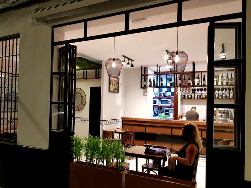 Una reforma que ha puesto de manifiesto el potencial de este coqueto local que se ha abierto completamente al barrio con grandes puertas correderas acristaladas. Dos imágenes destacan en sus paredes, un cuadro de Pepe el Bizco y un bonito azulejo de las columnas de Hércules en la Alameda, barrio donde se crió Juan. Al frente, una bonita barra de madera que esconde la cocina detrás. Cinco mesas dentro que son las que permiten los metros del local, dice Juan que ha pedido autorización para algunos veladores fuera. Unos maceteros de madera separan el salón interior de la calle, asi que si os sentáis junto a la puerta parece que estáis tapeando encima del empedrado. Lámparas de rejilla e incluso un pequeño jardín vertical. El color que predomina tanto en suelo como en las paredes es el blanco, lo que le da más amplitud al espacio.