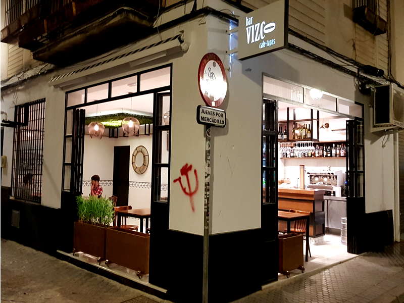 Hoy hacemos parada en la calle Castellar (no confundir con Castelar en el Arenal). Esta extensa vía del Casco Antiguo ha evocado hasta cuatro linajes sevillanos distintos. Además, este barrio ha visto nacer a importantes figuras de la cultura hispalense, y fue durante años el «escenario» de curiosos personajes que pasaron a la historia de Sevilla por motivos peculiares. En esta emblemática calle se encuentra El Vizco (con v). Un típico bar de barrio fundado en 1970, junto al famoso corralón de la calle Castellar, que acaba de sufrir una espectacular reforma para adaptarlo a los nuevos tiempos. El Vizco debe su nombre a Pepe el Bizco, hermano mayor de Juan Romero, dueño y fundador de un negocio que nació en la calle Lumbreras para luego desplazarse a este barrio junto a la Calle Feria. Juan Romero hijo nos cuenta que ya trasteaba por el bar desde pequeño y que con 8 años lavaba platos para ayudar a su padre cuando llegaba del colegio. En 2002 se queda definitivamente con el negocio de su padre, que acababa de sufrir un problema de salud. Juan hereda así un bar de barrio con un público leal, pero bastante mayor. Por eso tomo la decisión de llevar a cabo una gran reforma que cambiara la estética y el concepto global de este bonito establecimiento.