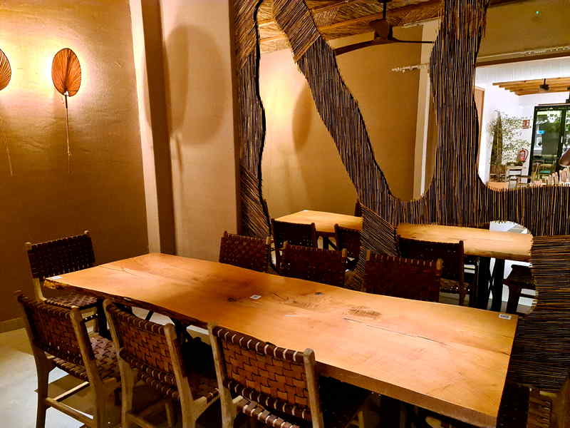 La decoración de Persevera Producciones está protagonizada por la luminosidad de su enorme terraza de inspiración ibicenca. Pero Delacruz tiene varios espacios diferenciados para distintos ambientes: un acogedor salón con una bonita barra de azulejos rojos, sillones corridos de mampostería y techos de vigas de madera rústica, la gran terraza de techos de cañizo esta dividida en dos zonas. Destaca por su profusa decoración, cálida y elegante, donde las plantas, como un hermoso olivo centenario, son las autenticas protagonistas. Persianas de esparto y estanterías adornadas con vasijas, lebrillos y tinajas de barro rojo, que le dan un aspecto rústico al conjunto. Acaban de poner en marcha un nuevo salón y zona de terraza que amplia considerablemente la capacidad para recibir clientes. Una zona añadida que conserva los aires mediterráneos de la decoración original. La calidez que transmiten las cerámicas que adornan las estanterías, las vigas de madera del techo, los ventiladores de techo, las sillas de cuero trenzado, las plantas naturales y la luz tenue y cálida, aportan un aire relajante y sosegado. El espacio en Delacruz invita a ser vivido. Todo encaja, es equilibrado. La nueva terraza esta adornada de miles de bombillas leds que le dan una iluminación eficaz, discreta y romántica. Una decoración que fusiona las dos zonas como si siempre hubieran estado unidas.