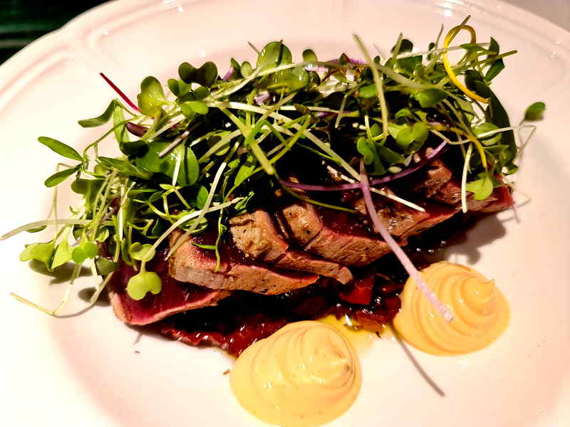 Si existe una empresa que haya marcado en los últimos años un antes y un después en el perfil gastronómico de la ciudad de Sevilla, esa es Ovejas Negras Company (Genoveva Torres y Juan Manuel García). Una compañía que nace allá por el 2011 y que una década después abrieron su local numero 12 para aterrizar por primera vez en el Aljarafe. Delacruz abrió sus puertas en Tomares en 2020 con un espacio sencillo que reivindica la cocina mediterránea, consiguiendo una perfecta simbiosis entre modernidad y clasicismo con una cuidada decoración. Estamos en una brasearía con un toque rústico/moderno, marca de la casa, en una atmósfera con encanto y un agradable servicio capitaneado por Álvaro, un simpático encargado de sala que nos atendió con profesionalidad y como jefe de cocina Federico Pappalepore, un argentino de Lanus ( Provincia de Buenos Aires) que conoció a Genoveva y Juan Manuel en la Hacienda Benazuza y trabajo en cocinas estrella Michelin hasta convertirse en chef ejecutivo del grupo.