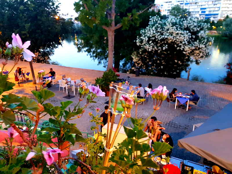 Así fue como nació Lola Cazerola de la calle Castilla 36, una terraza con mucho encanto ubicada en una zona privilegiada de la ciudad. Un original establecimiento de ambiente bohemio, frescura y el cauce del río a escasos metros. Grandes árboles dan sombra a numerosas mesitas siempre llenas de parejas y grupos de amigos tomando algo o cenando. Y es que este es un sitio perfecto para disfrutar de una rica comida al aire libre. El establecimiento tiene una capacidad para cerca de un centenar de personas y se divide en varios espacios distribuidos en terrazas. Una zona de barra, otra de mesas altas y una tercera que hace las veces de salón y que da paso a una terraza con vistas al Guadalquivir donde los clientes pueden disfrutar tanto en invierno como ahora que llega el verano. Platos de la tierra, un ambiente familiar y un buen servicio son el secreto del éxito de Lola Cazerola. Luz tenue y decoración de estilo Kitsch, con predominio del color y las formas, así como de elementos llamativos. Mesas y estanterías cargadas de adornos extravagantes, velas encendidas y amor por el coleccionismo de objetos cotidianos: Botellas, botijos, espejos… Aquí podréis disfrutar de un ambiente acogedor, en ocasiones acompañado de conciertos de artistas en directo.