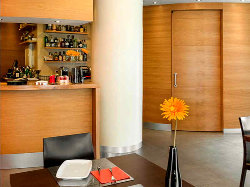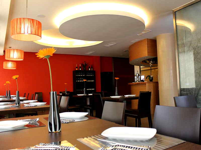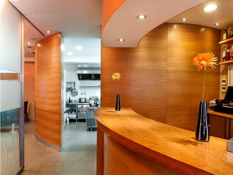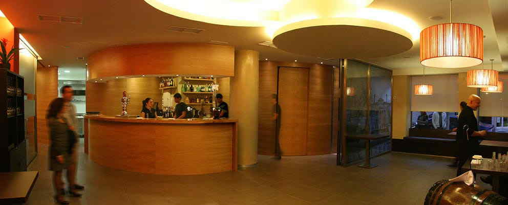 En cuanto al ingenio detrás de la creación arquitectónica del lugar, está Manuel López Arquitectos. Al llegar, lo primero que vemos es la esquina que ocupa el local con los muros revestidos en piedra y grandes ventanales a la calle. El interior es una fusión entre ambiente moderno y clásico, mezclado colores y texturas con una decoración y un entorno cálido y acogedor. Un establecimiento de estilo urbano con espacios ordenados y líneas uniformes de colores sobrios. Un elemento esencial es la original barra curva en el centro del local que divide el local en dos salones. Lámparas colgantes, mesas rectangulares de madera oscura y sillas en negro. Paredes de colores cálidos y una estudiada iluminación que ayuda a estar más cómodos. Es ante todo un tipo de espacio renovador y atrevido, que luce muy bien con la aplicación de clásicos de diseño, como las lámparas o el sillón corrido.
