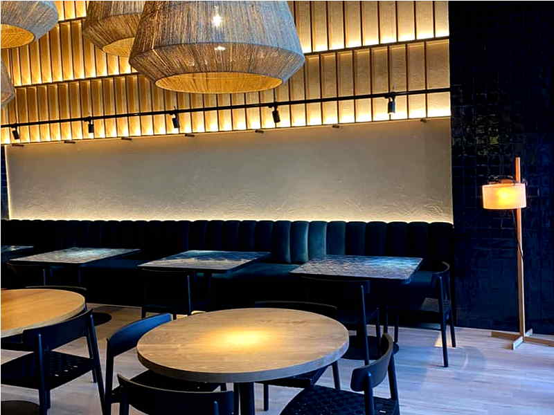 Tradevo Nervión acaba de mudarse a la avenida Diego Martínez Barrio, junto al hotel NH Collection y a 500 metros del que fue su primer establecimiento. El nuevo Tradevo, de 160 metros cuadrados, cuenta con una capacidad en sala para 40 comensales y una amplia y agradable terraza privada para 50/60 personas. El local que estaba situado en la Plaza Pintor Amalio García del Moral abrió sus puertas en 2010 y ahora sale de los bajos de un edificio de viviendas para abrirse al barrio en una zona de gran proyección comercial. Un local mucho más espacioso, decorado por Persevera Producciones y Juan Pedro Donaire. Una decoración que muestra el equilibrio de los distintos elementos que componen el espacio, creando un ambiente elegante, acogedor y vivo. Colores cálidos y naturales, donde el blanco y el azul están muy presentes. Con una fachada muy sobria, lo primero que se ve al entrar es la cocina a través de unas cristaleras. En la sala principal destacan los techos de 6 metros de altura y el uso de materiales naturales como la madera. Con una cocina más amplia que le permite trabajar en nuevos platos, en el centro del local se han colocado mesas redondas bajo una iluminación central de grandes lámparas de caña y en los laterales unos bonitos bancos corridos azules que permiten optimizar el uso del espacio y las distancias entre comensales. El edificio cuenta con parking propio.