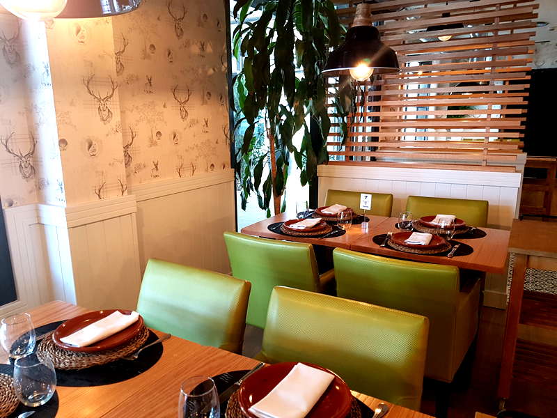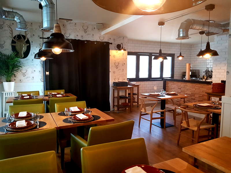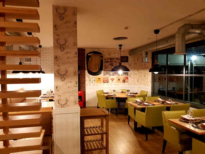 Vakum trae al Aljarafe una gastronomía de calidad basada en las carnes a la piedra, en un espacio de estética rústico-industrial concebido para dar calidez. Lámparas de metal, sillones de piel en tonos verdes e incluso bancos corridos, conforman una decoración que convierten el local en un espacio acogedor y cálido. Detalles que lo adornan como las plantas, la chimenea chubesqui roja o las simpáticas cabezas de animales hechas de esparto natural. El restaurante se distribuye en un salón diáfano de suelos de madera flotante donde la iluminación juega un papel protagonista, aprovechando las cristaleras que dan a una enorme terraza cubierta.